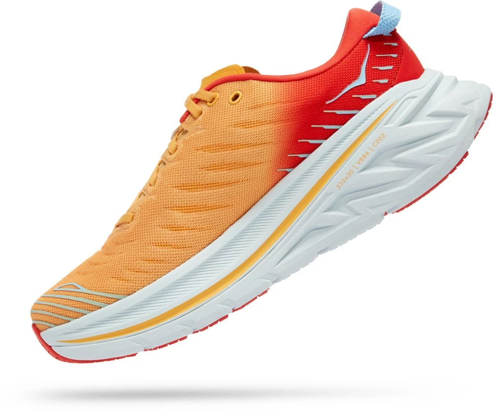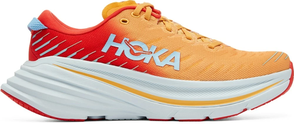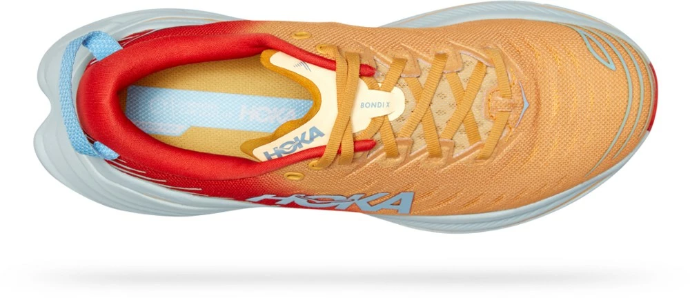 - Compared to the rest of the Bondi line, the Bondi X feature an extended rocker profile for greater acceleration and carbon-fiber plates for smoother toe-offs