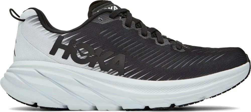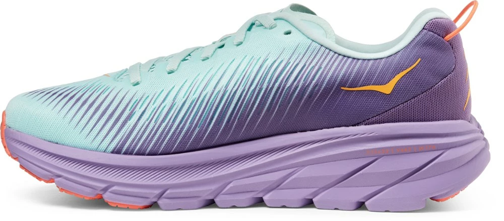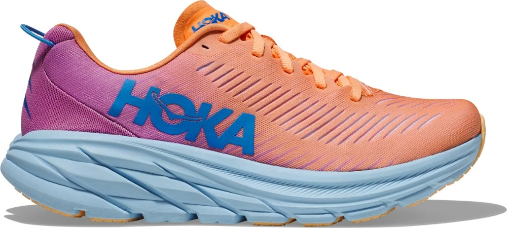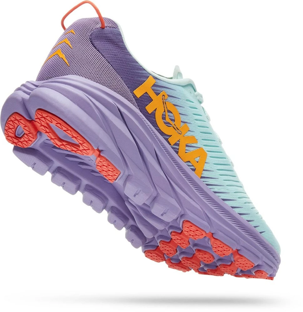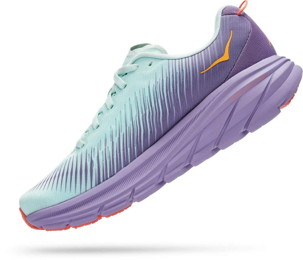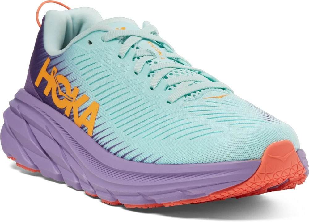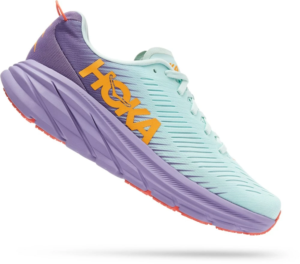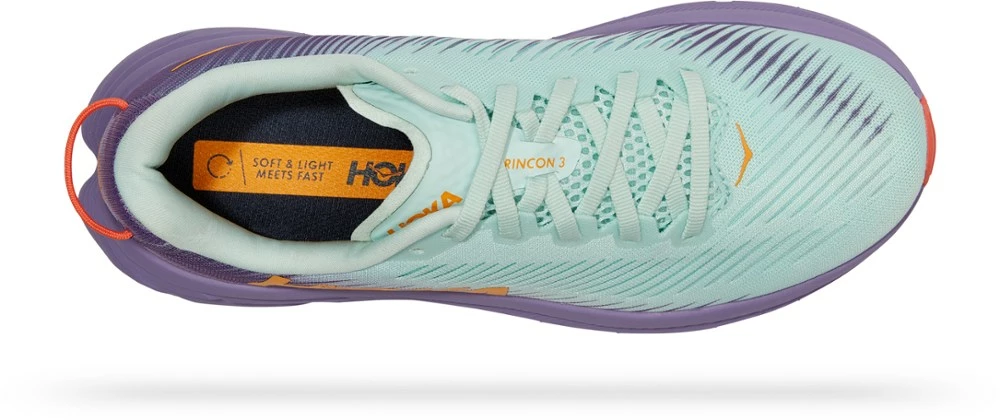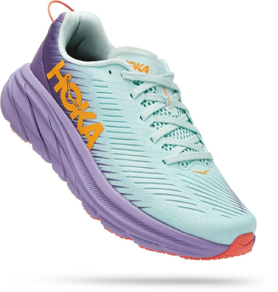 Defy expectations—and set PRs—with the women’s HOKA Rincon 3 road-running shoes. This redesign features asymmetrical tongues, thinner pull tabs and vented-mesh uppers for breathability.