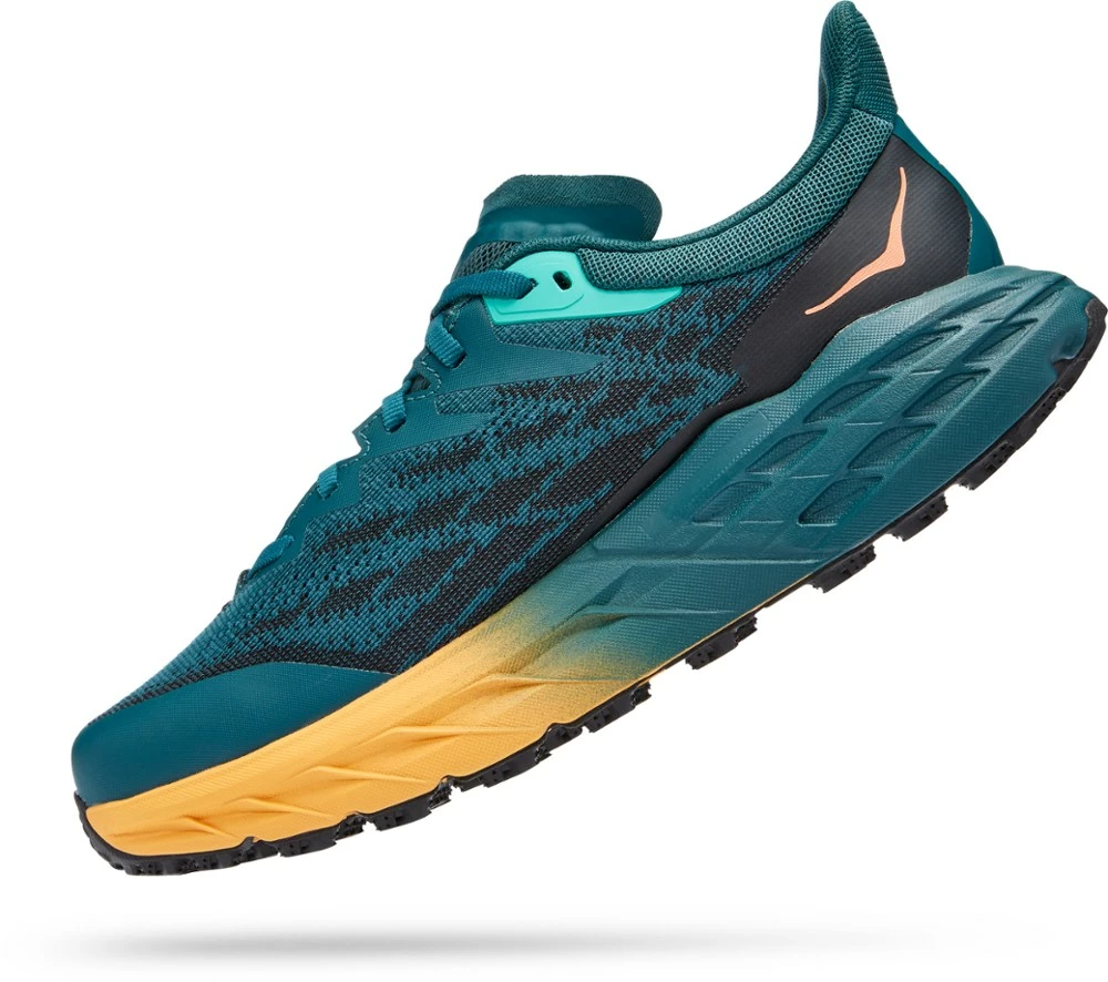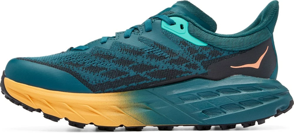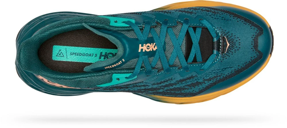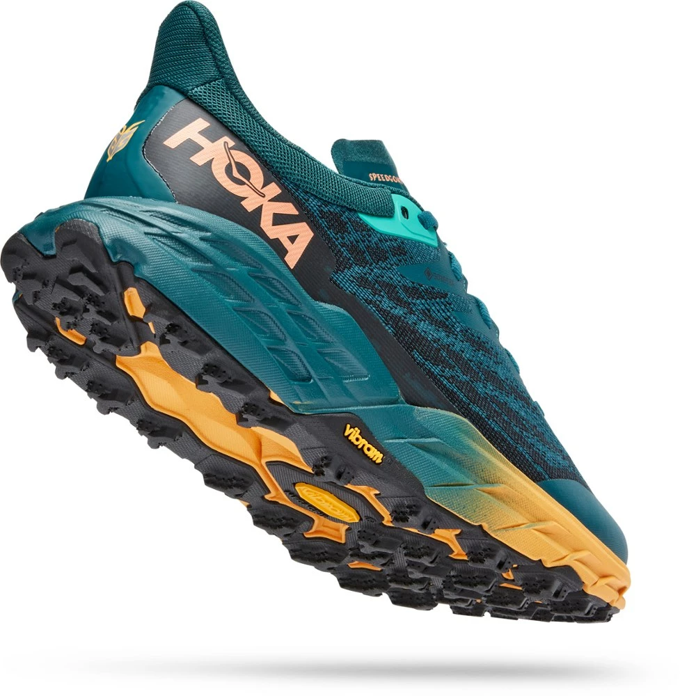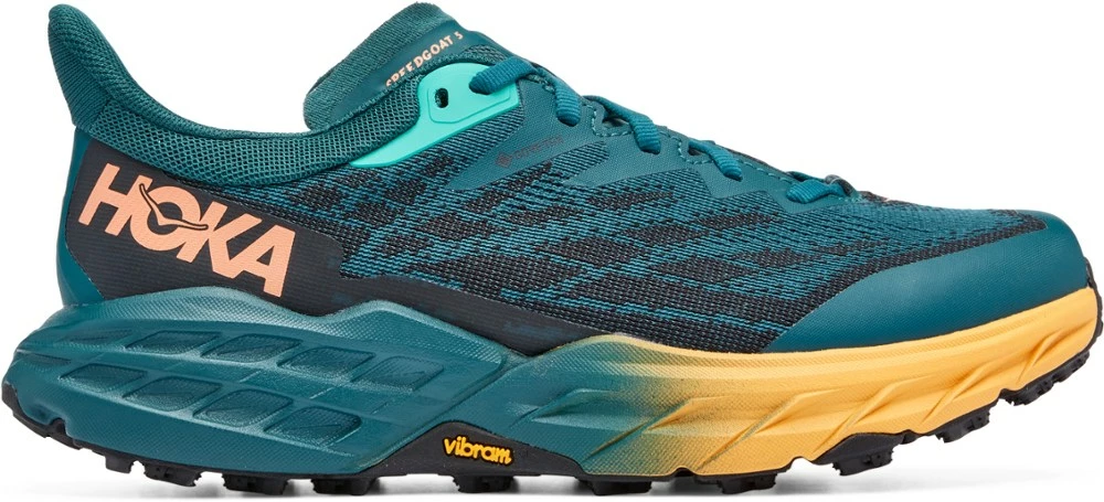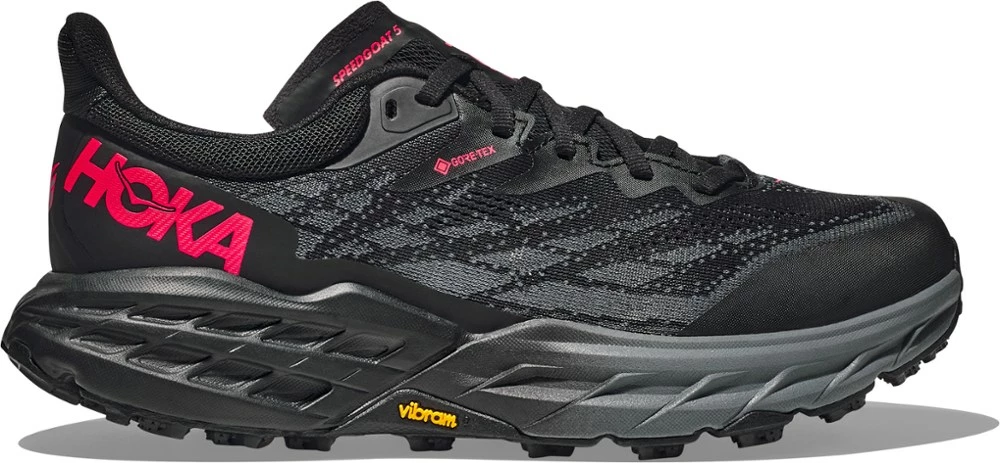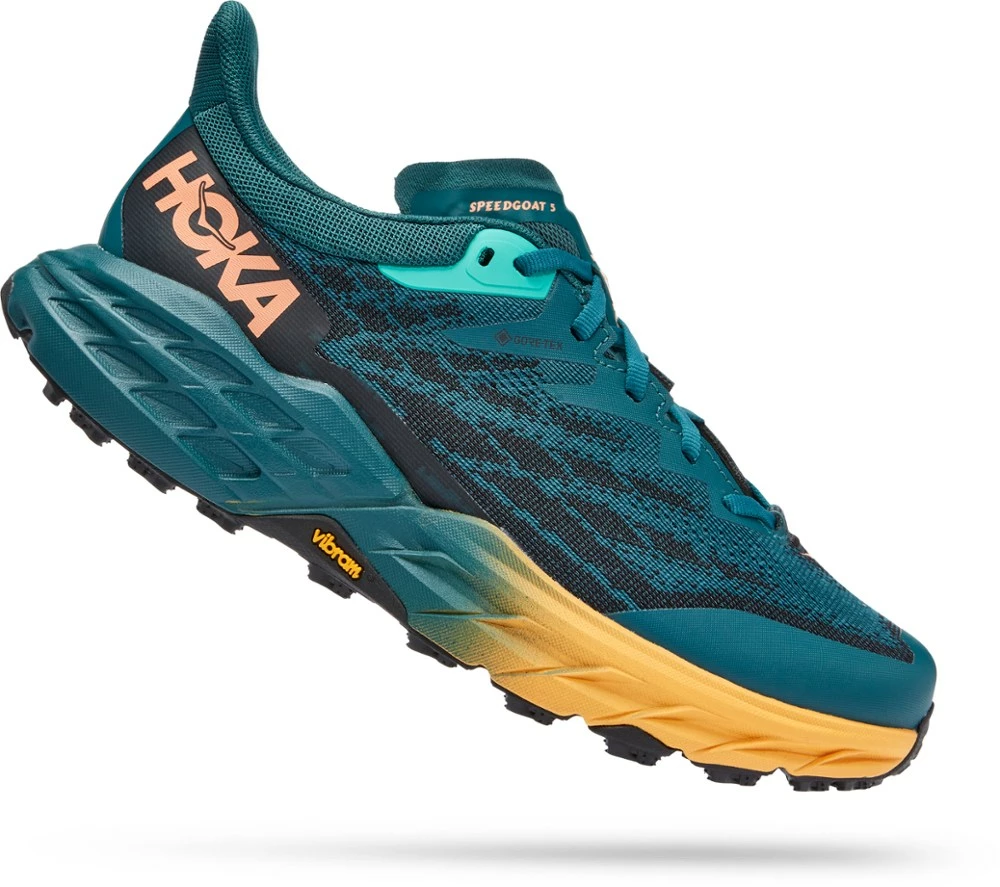 A workhorse for sloppy, wet conditions, the HOKA Speedgoat 5 GTX trail-running shoes feature brand-new uppers and dependable moisture management with GORE-TEX waterproof, breathable membranes.