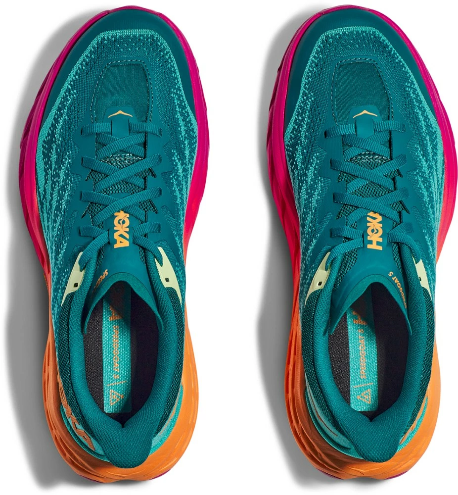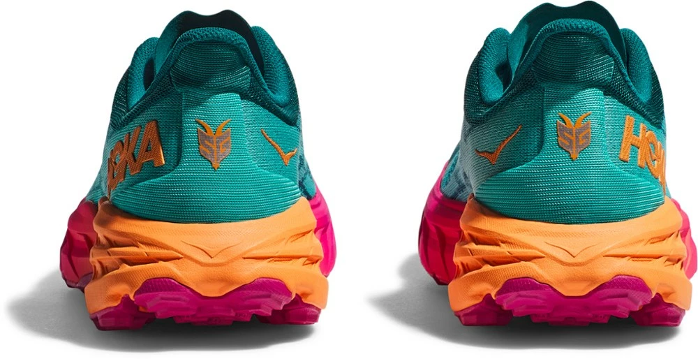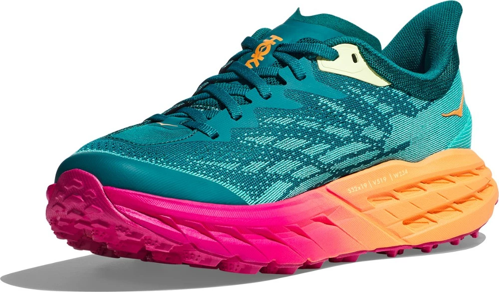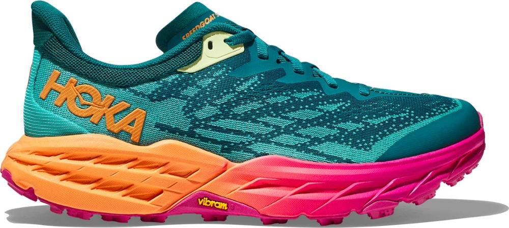 Grippy. Cushioned. Trailblazer. Technical trail workhorses, the women’s HOKA Speedgoat 5 trail-running shoes improve on their predecessors with less weight and more traction than ever before.