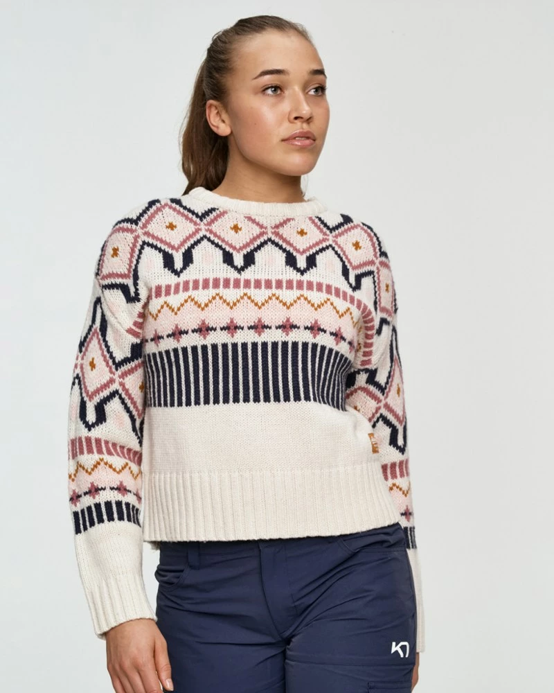 With the coziness of a soft wool blend and the standout style of its distinctive jacquard knit pattern, this Kari Traa Molster Knit sweater is a great choice for casual wear in cold weather.