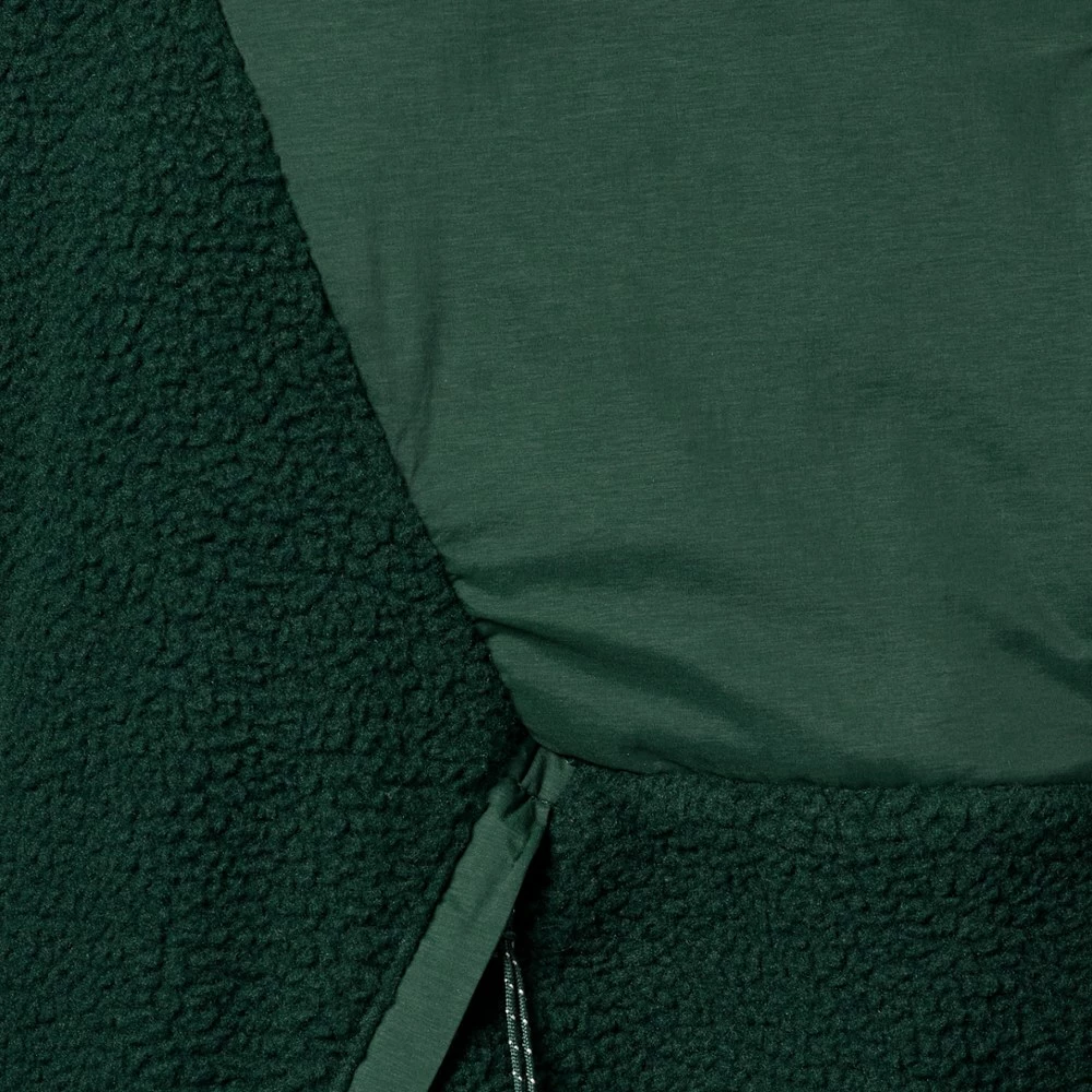 - Loose fit with a high collar, full-zip closure, chin guard and zipper garage