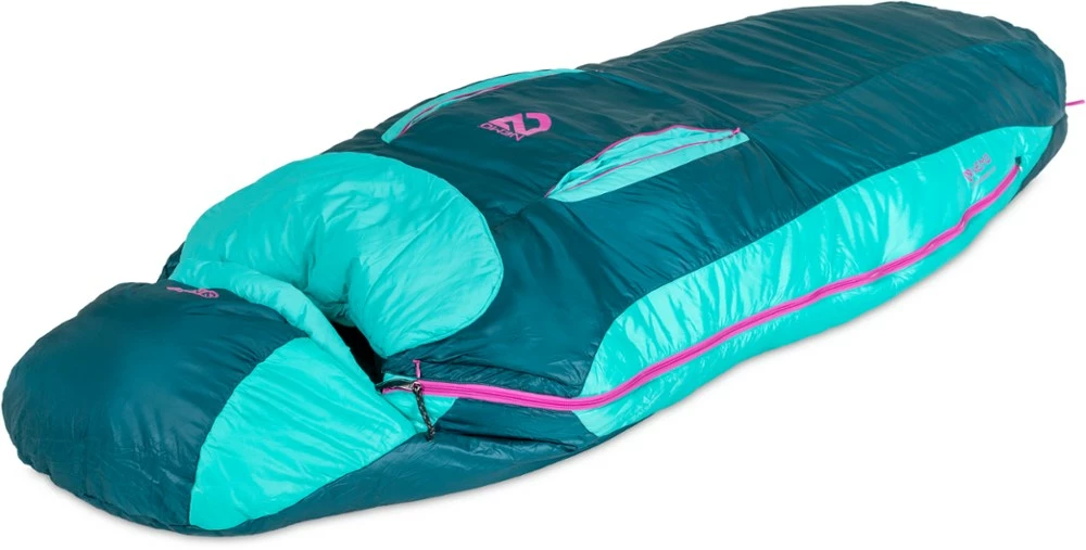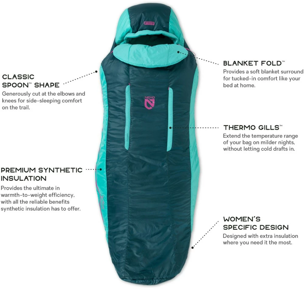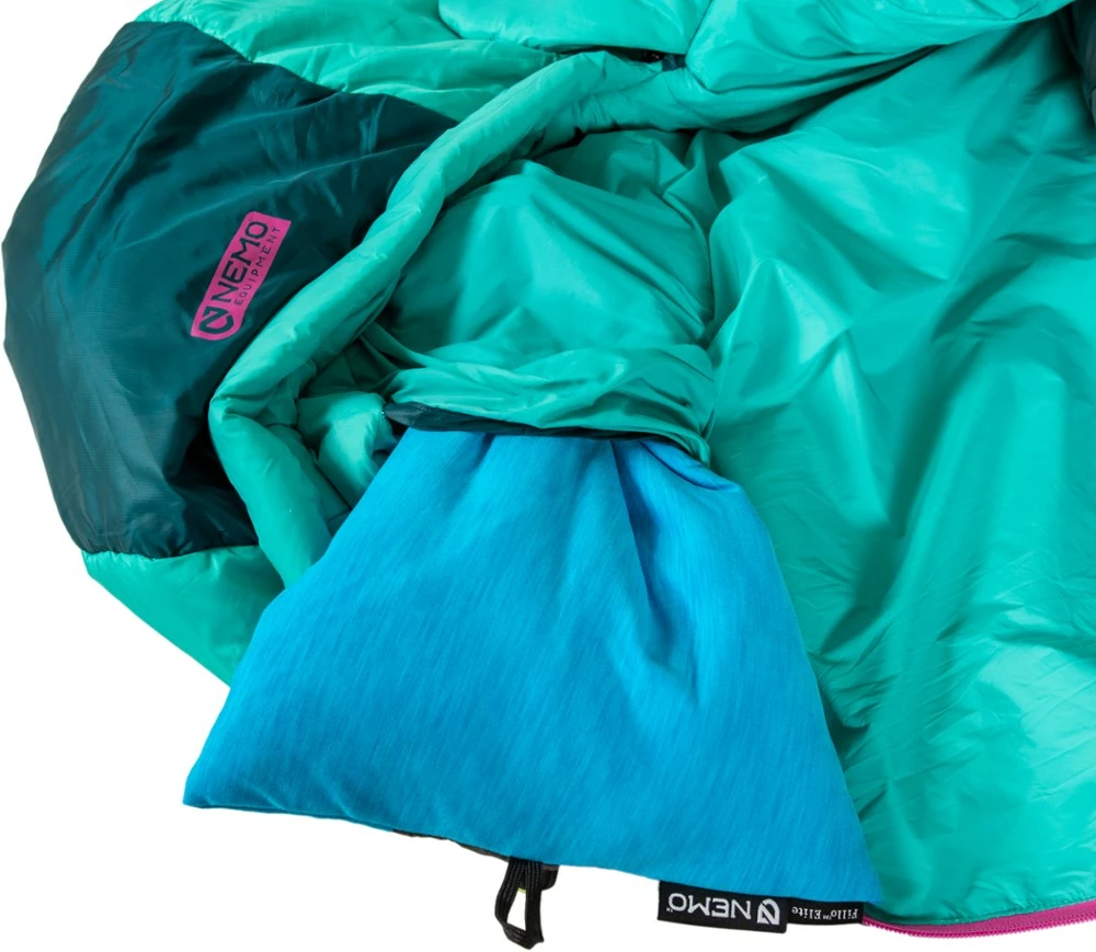 Classic mummy-bag design isn’t ideal for the 70% of people who sleep on their side. The women’s NEMO Forte 35 sleeping bag adds room at the elbows and knees for 3-season, side-sleeping comfort.