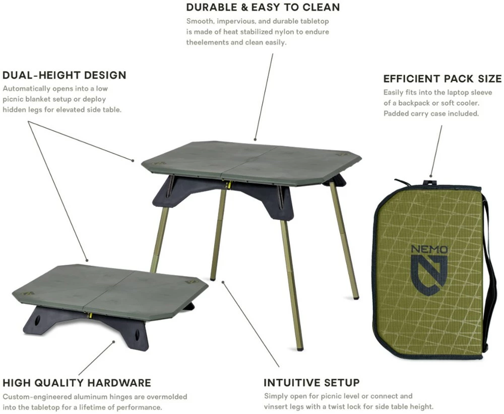 Whether you’re on the beach, camping in the woods or gathering in the backyard, the NEMO Moonlander camp table provides a clean, stable surface for preparing and serving meals outside.